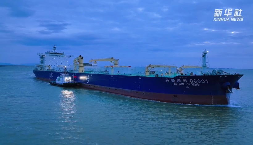 全球首艘自航式封闭式三文鱼养殖船“苏海一号”23日在江苏省连云港市赣榆区开始运营。 “苏海一号”是一种集优质鱼种养殖、捕捞、加工功能于一体的智能型海上养殖装置。长度249.8米,养殖用水量8.3万立方米。经营稳定,三文鱼年养殖量可达8000吨以上。记者:毛军 摄影:张南宁